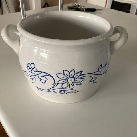 Valkoinen soikea vati. Sinisiä kukkakuvioita. Reunassa särö, pieniä naarmuja. Mitat 42,5 x 34,5. Pohjassa piippu-Arabian merkki, alapuolella 5. Toinen merkki pohjassa allekkain LL , ARABIA, NN8, 259, C, 17.