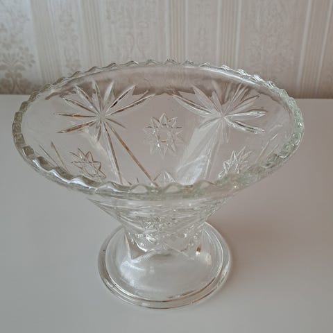 Lasinen kauniskuvioinen, hyväkuntoinen kristalliastia. Mitat leveys 16 cm, pituus 25 cm, korkeus 10 cm. Paksua lasia. Pakkaan hyvin.