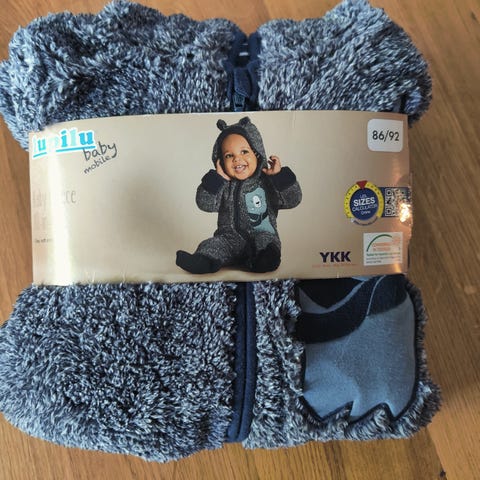 Lupilu lasten fleece haalari, koko 86/92. Haalarissa huppu sekä pitkät hihat ja lahkeet, vetoketju edessä.