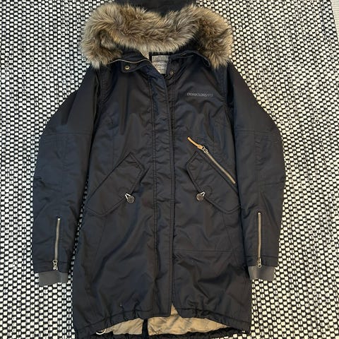 Toppatakki. Hupun "karva"reunus irrotettava. Kiristysnyöri hupussa, vyötäröllä ja helmassa.