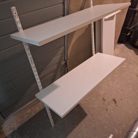 Hyllylevyjä, kiskoja ja kannattimia kaikki kerralla tuutko hakemaan. Vaativat putsausta jotkut.