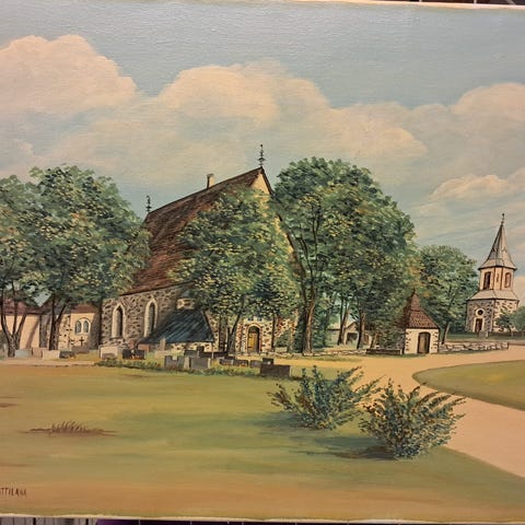 Upea valokuva kehyksessä Porin maamerkistä, keski porin kirkosta.