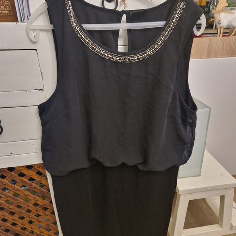 Vilan musta mekko jossa kuviointia edessä ja hihoissa. Takana vetoketju joka toimii. Pituus hartiasta helmaan n.92cm