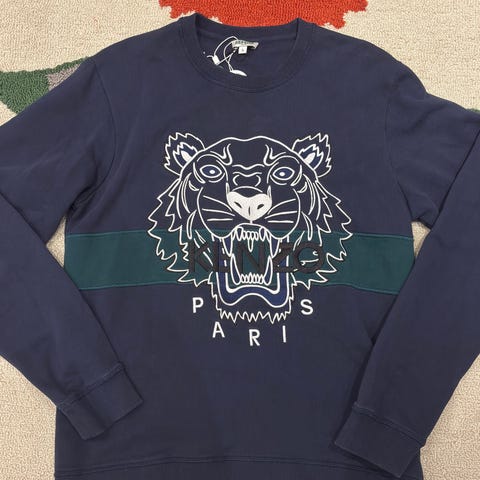 Kenzo Sininen Miesten L Kokoinen Paita, jossa on pitkähihaiset hihat ja kirjailtu tiikerin kuva edessä. Materiaali ei ole määritelty, mutta paita on suunniteltu miehille ja siinä on sininen väri. Fit s/m