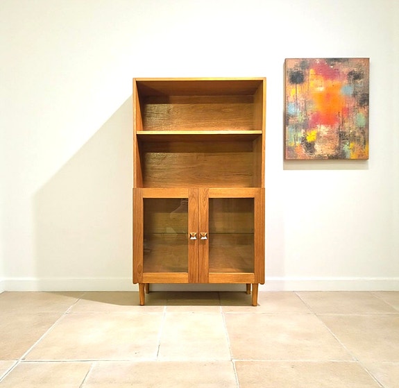 Kaunis vintage teak vitriinikaappi. Kaapin sisällä lasinen ja avo-osassa puinen hyllylevy, hyllylevyt saa pois.