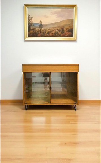 Kaunis vintage teak vitriinikaappi (ILMAINEN kuljetus)