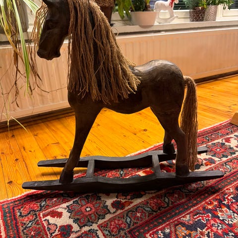 Animoitu pikku-tyttö, joka keinuu keinuhevosella. Laulaa/juttelee (englanniksi).