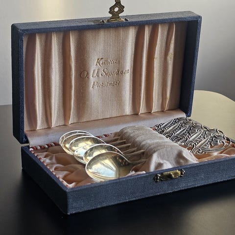 Lusikat on säilytetty alkuperäisessä kotelossaan, joka on sininen ja vuorattu vaalealla kankaalla. Sarja soveltuu esimerkiksi kahvi- tai jälkiruokalusikoiksi.
