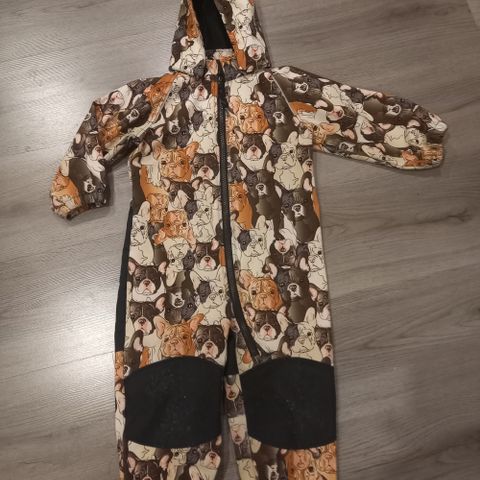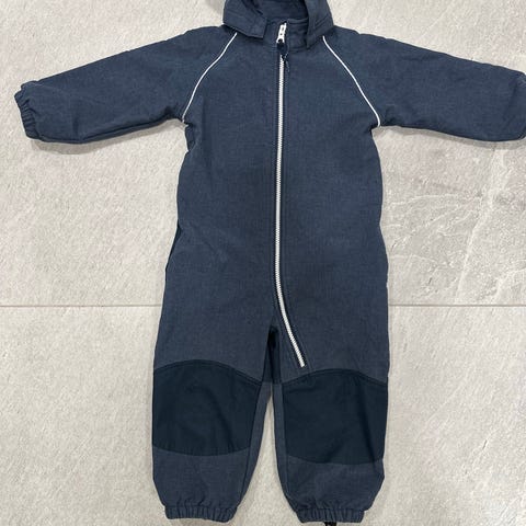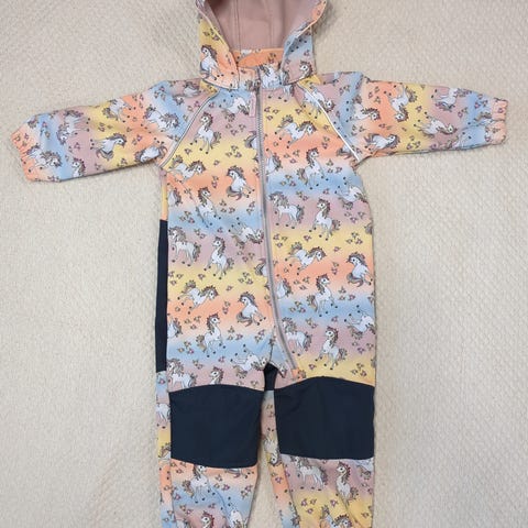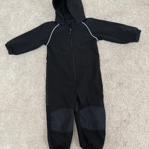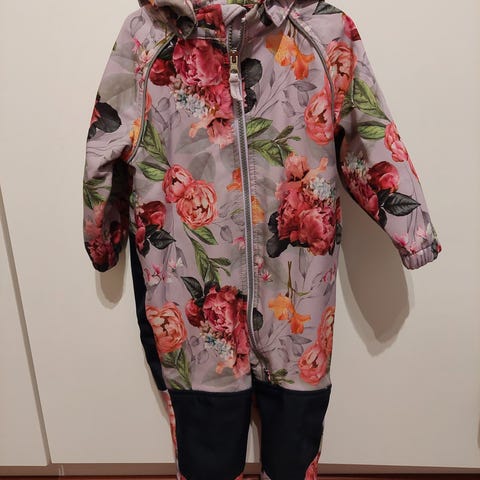 Name it -merkkinen softshell-haalari, koko 86. Mielestäni tilavaa kokoa, mahtui melkein kaksivuotiaaksi. Polvissa ja takapuolessa pieniä käytön jälkiä, vaikka onkin ollut meillä parempana haalarina. Yleisilme kuitenkin siisti.