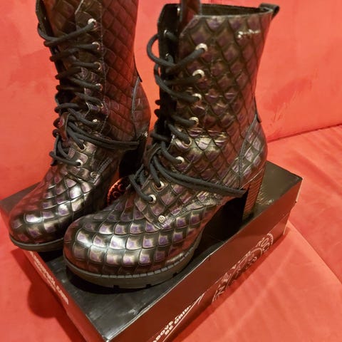 Käytön jälkiä näkyvissä, kuten kulumaa nahkapinnassa ja pohjissa, mutta ei mitään, mikä vaikuttaisi käyttöön.