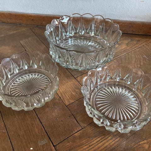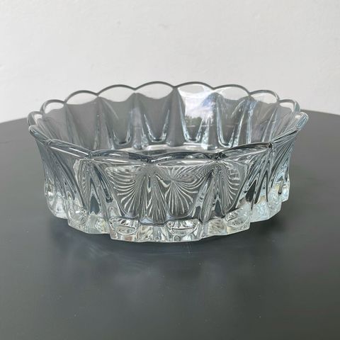 Riihimäen Lasin Kuningattaren kruunu -tarjoilukulho, jossa kaksi hiushalkeamaa, ikäänkuin olisivat lasin sisällä, sillä eivät tunnu sormenpäällä. Olen yrittänyt kuvata ne kahteen viimeiseen valokuvaan. Tällaisenaan soveltuu kuvien tuotteiden tarjoiluun tai sisustuselementiksi. Korkeus 7,5 cm, Ø 19 cm. Nouto.