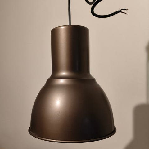 Vanha kattovalaisin, valmistettu tapuisasta materiaalista, sisäpuolella kultainen pinnoitus.