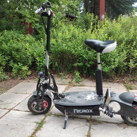 Electro scooter in good condition e-kick from Biltema, was used about 1 month, couple scratches on body. Holds charge up to 20 km. Solid tires, one suspension at the front.