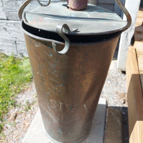 Turva merkkinen metallinen palosammutin/ämpäriruisku, kuparia. Korkeus kahva alhaalla n. 60 cm. Vanha. Vuotaa vähän juuresta, vesi tulee paineella. Vintage. antiikki. Koristeeksi tai korjattavaksi käyttöön.
