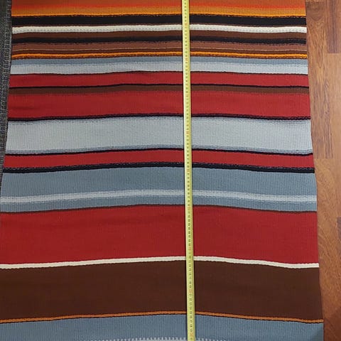 Monivärinen raidallinen kangas. Kangas sisältää keltaisia, oransseja, punaisia, mustia ja vihreitä raitoja.