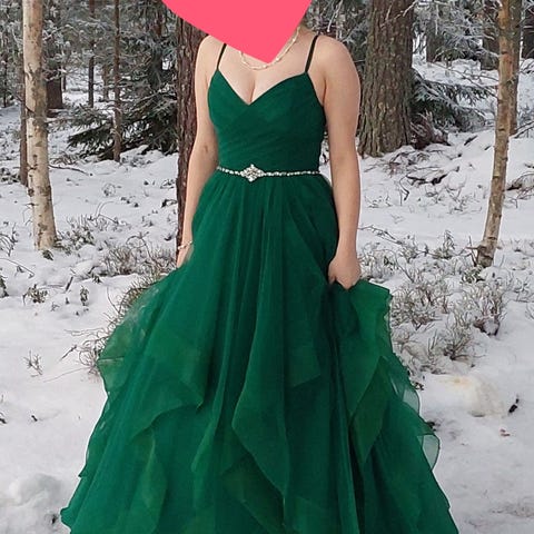 Zazabella ilta- tai juhlapuku, koko M, väriltään vihreä. Puku on valmistettu Suomessa. Sopii erityisesti naisten käyttöön juhla- ja iltatilaisuuksiin.