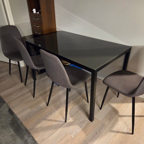 Tuoleja 6 kpl ja niissä on kangaspäällinen ja erittäin tukevia (ei nitku).