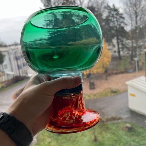 Hyväkuntoinen Nuutajärven puna-sini-vihreä taidelasi 70-luvulta. Suunnittelija Kaj Franck, ei signeerattu. Mieluiten nouto Leppävaarasta tai Haagasta, mutta postitus onnistuu myös.