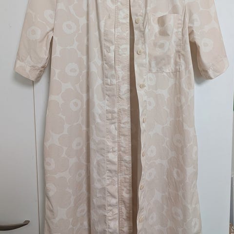 Palsta-paitapuseromekko on valmistettu Mini Unikko -kuosisesta puuvillasta. Lyhythihaisessa napitettavassa mekossa on rintatasku, A-linjainen leikkaus ja irrallinen vyö.