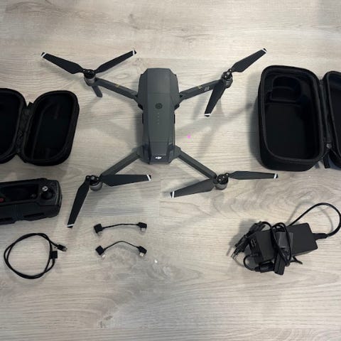 DJI Mavic Pro -kamera‑drone harmaana värinä. Pakettiin kuuluu taittuvilla potkureilla varustettu drone, kauko-ohjain, useita akkuja, potkurisuojia sekä olkalaukku säilytystä ja kuljetusta varten. Drone soveltuu ilmakuvaamiseen ja -videointiin, ja se on suunniteltu helppoon mukana kuljettamiseen kompaktin kokonsa ansiosta.