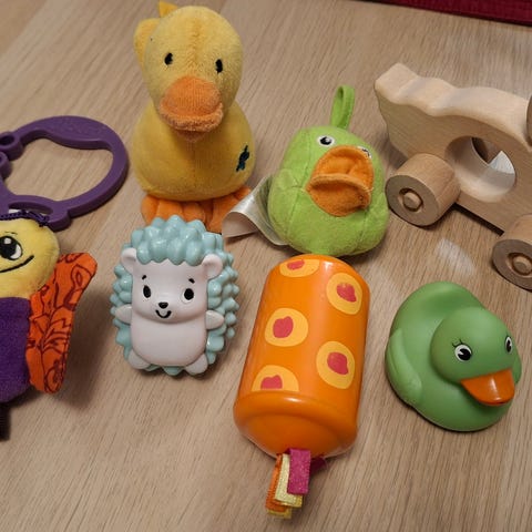 Taaperon / vauvan lulu. Avautuvat kananmunat, joissa eriväriset ja muotoiset sisukset.
