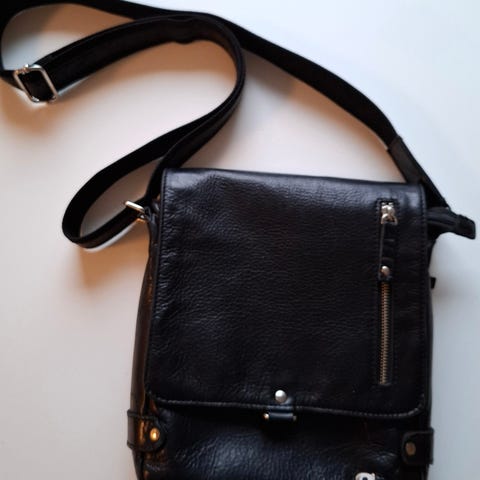 Hyväkuntoinen musta crossbody nahkalaukku. Leveys 22 cm, korkeus 16 cm, syvyys 2 cm. Säädettävä olkahihna. HIntaan kuuluu postikulut.