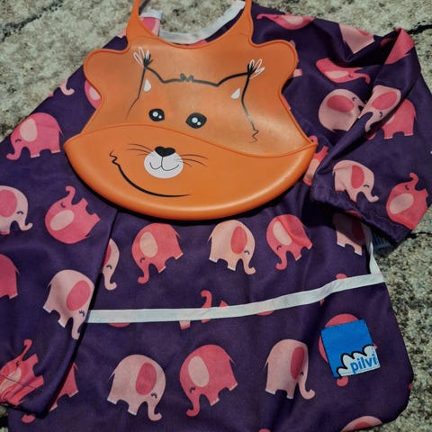 Myydään yhdellä lapsella käytetty ruokalappu. Silikonia ja voi pestä astianpesukoneessa.