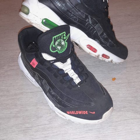 Myydään hyvässä kunnossa olevat NIKE AIR MAX 95 WW WORLDWIDE BLACK-WHITE-GREEN STRIKE 42.5