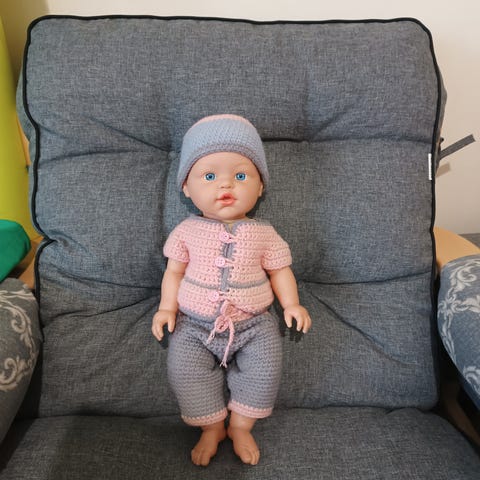 Nukke, johon kuuluu neljä erilaista asukokonaisuutta: valkoinen mekko sinisillä kukilla, vaaleanpunainen mekko, vaaleankeltainen neuletakki tummansinisellä hameella sekä oranssi-valkoinen virkattu mekko. Nukke on tyttöjen leikkeihin soveltuva lelu.