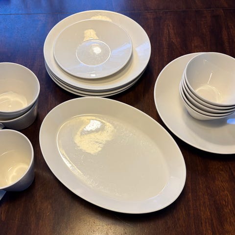 Kahdessa toisista lautasista on hyvin pieni naarmu molemmissa, tullut säilytyksessä, keskiosassa lautasta. Myös kahteen kuppiin on tullut hyvin pieni ja huomaamaton jälki kupin sivuun, ei naarmuja eikä muita jälkiä. Toinen näistä kupeista on aavistuksen isompi, tämän mukin olen ostanut eri aikaan kuin toiset joten on luultavasti eri tuotantoerää. Tarrat näistä on kaikista poistettu, muutaman kerran käytössä on ollut vain tuo viimeksi mainittu muki (joka vähän isompi kuin toiset) mutta muita ei ole käytetty lainkaan.