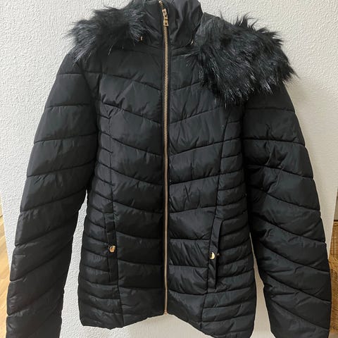 Uusi, musta,Elloksen toppatakki. Koko 164 cm. Pituus olkapäästä takin helmaan n.74 cm. Vyötäröllä säätönarut.
