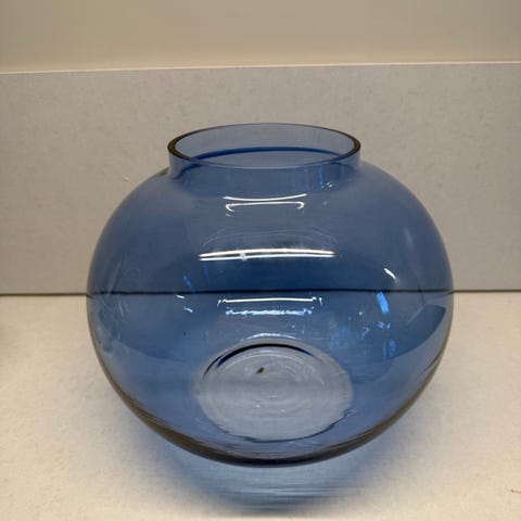 Pieni sininen maljakko, tuikku osoittamassa kokoa. Pohjassa ilmakupla. Särö n. 3 x 1 mm, viimeisessä kuvassa nuolella osoitettuna.