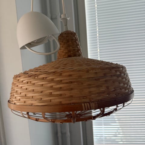 Kupu paksua maitolasia. Sisäpinta kuvioitu, ulkopinta sileä. Kuvun korkeus 9cm ja halkaisija 12,5 cm. Johtojen pituus n.95 cm.