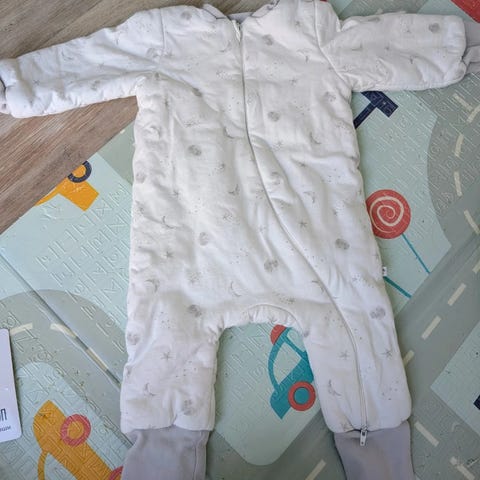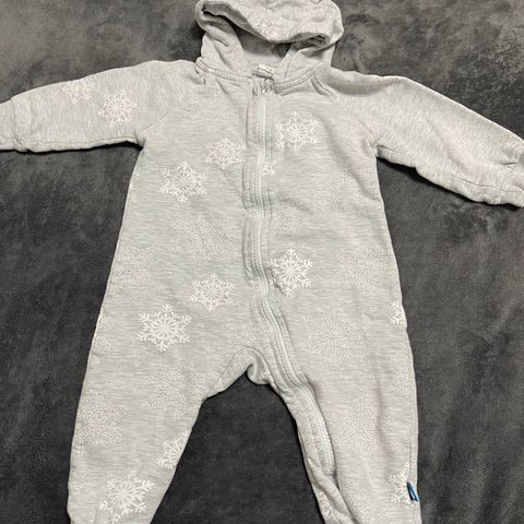 Peuhun valkoinen haalari ruskeilla täplillä. Lahkeen- ja hihansuut saa käännettyä umpeen.