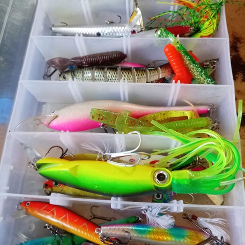 Kaikki kuvan vieheet, puntari sekä pakki matkaan. Pakista löytyy myös joitain jigejä kuten kuvista näkyy.