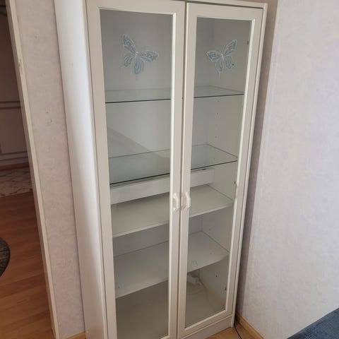 Leveys 88cm. Korkeus 190 cm. Lasiovet. 3 lasihyllyä. Alhaalla yhtenäinen tila.