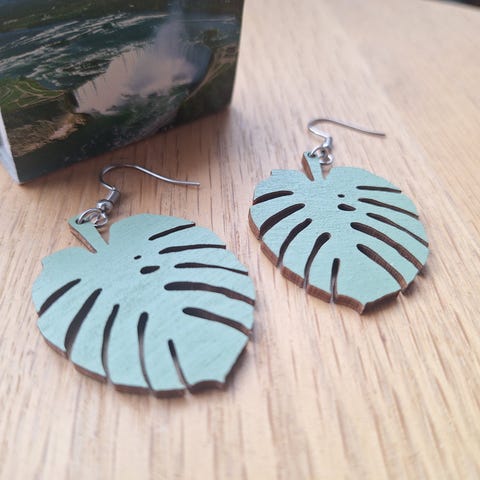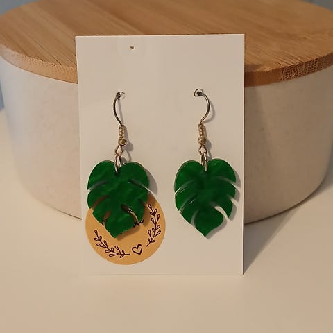Ehkä kerran tai kahdesti pidetyt upeat violetit peikonlehti korvikset. Koukkuosa todennäköisesti kirurginterästä, koska en ole itse saanut siitä mitään oireita. Korvisten korkeus noin 6 cm ja leveys 5cm.
