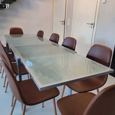 Karkaistulla lasipinnalla ja polttomaalatuilla jaloilla varustettu pöytä, jossa lasipinnan alla tuppeensahattua leppälankkua.