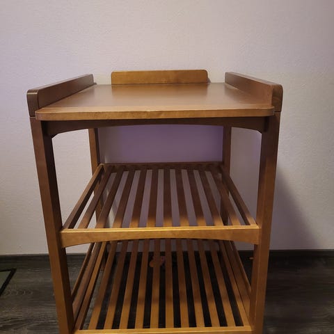 IKEA lastenhuoneen hoitopöytä, valmistettu valkoiseksi maalatusta puusta. Hyllyssä on kolme tasoa.