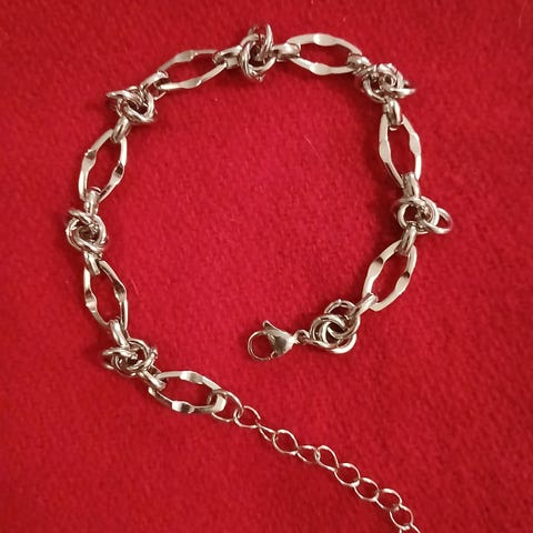 Kaunis vintage ranneketju siroa filigraania. Pituus noin 19,5 cm. Leveys noin 7 mm. Koukkulukko. Kuulemma hopeinen, mutta en löytänyt leimoja, joten voi olla myös hopeoitu. Hyväkuntoinen, pientä tummumista mutta hyvin vaalea koru.