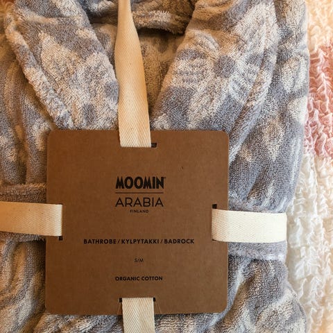 Moomin Arabia / Muumi 80-mallistoa. Koko S-M. Vaaleanpunainen kylpytakki, ohuehkoa 100% puuvillaa.