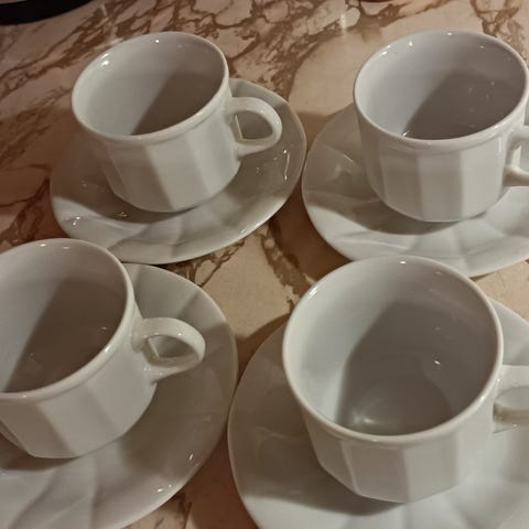 Ehjät ja kauniit kahvikupit 4 kpl ja aluslautaset 5 kpl yhteishintaan. Kaikki koristeet ovat kunnossa, ei lohkeamia tms. Koirakoti.