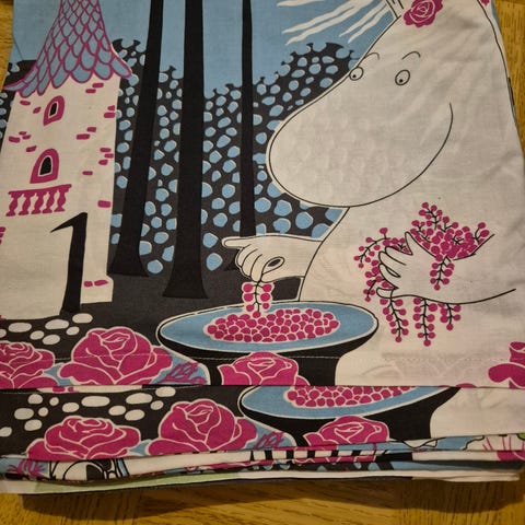 Tehdasvalmisteinen verho. Pituus reilut 150 cm. Muuten erittäin hyväkuntoinen mutta toisesta reunasta alhaalta revennyt suikale n. 30 cm matkalta. Kaventamalla pari senttiä repeämän saa pois päiväjärjestyksestä.