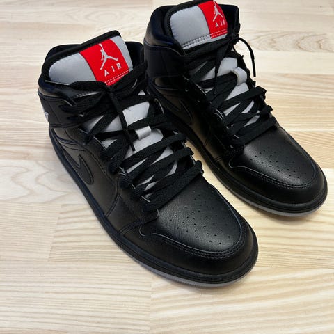 Air Jordan 1 Tennarit, koko 40,5. Värit harmaa/ vaalea. Materiaalina nahka. Korkeavartiset tennarit, joissa rei'itetty kärki ilmanvaihtoa varten. Ulkopohja kumia, jossa kuvioitu pito. Muutoin täysin ehjät, ainoastaan kuvassa näkyvä pohjan kuluminen.