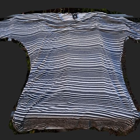 Kaksi Nanson raitatoppia koossa XXL. Mustavalkoisessa topissa on hieman kapeammat raidat ja pyöreä kaula-aukko, pinkki-valkoisessa topissa taas V-kaula-aukko sekä hieman leveämmät pinkit raidat. Molemmat jonkin verran olleet käytössä, mutta edelleen hyvä kunto ja kirkkaat värit.