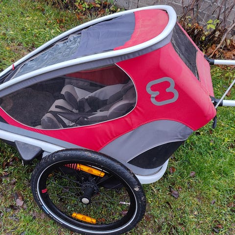 Tästä juoksurattaat tai pyöräkärryksi muuntuva laite. Kunto hyvä lukuunottamatta haalistunutta väriä ja sivumuovissa olevaa paikkaa lukuunottamatta. Kärryyn löytyy myös pyörään akseli jonka mitat kuvassa, ollut Specialized pyörässä kiinni, tämä lisähinnasta mukaan