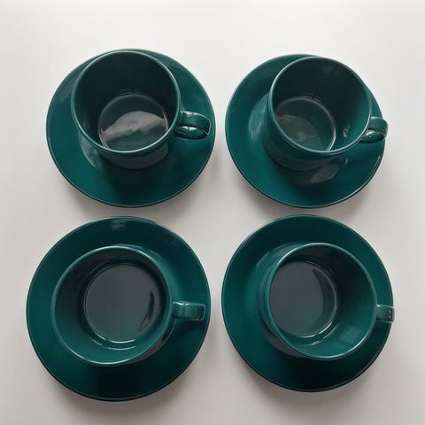 Valkoiset kahvikupit n.1,2 dl, siniset lautaset yhteensä 28 paria.