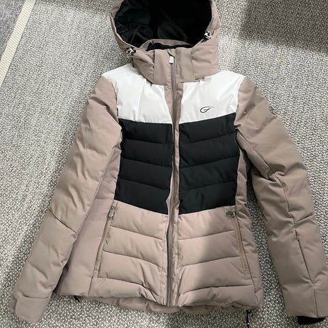 Suora malli. Kaksisuuntainen vetoketju. Huppu. Kullanväriset vetskarit.
