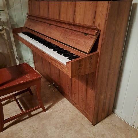 Annetaan Suomessa valmistettu Fazerin piano. Kooltaan leveys 145cm syvyys 52 cm ja korkeus 110 cm. Toimiva, mutta kaipaa toki viritystä. Piano on vuodelta 1968 ja sisällä laadukas saksalainen Renner koneisto.