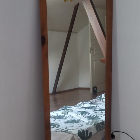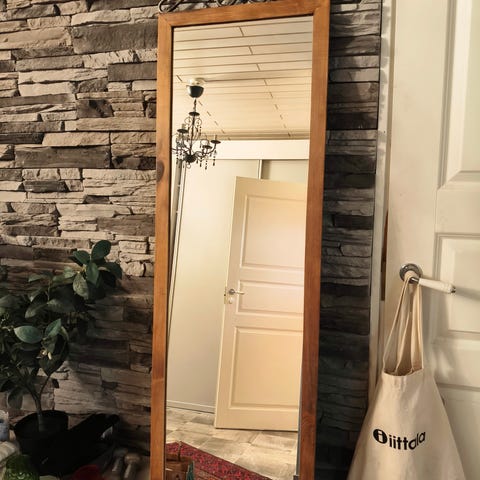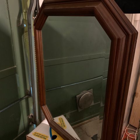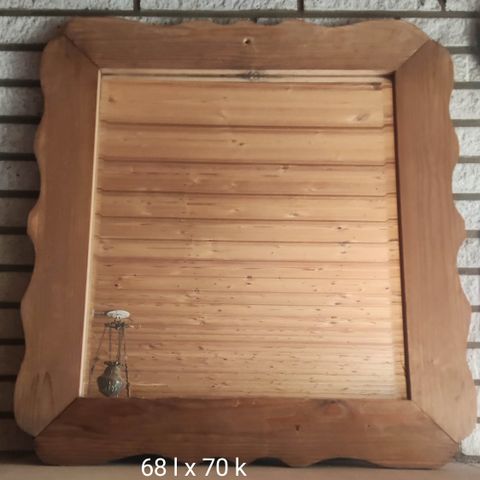 Peili puukehyksellä, mitat 60x80 cm. Kehys on valmistettu puusta ja väriltään ruskea. Sopii seinälle ripustettavaksi.